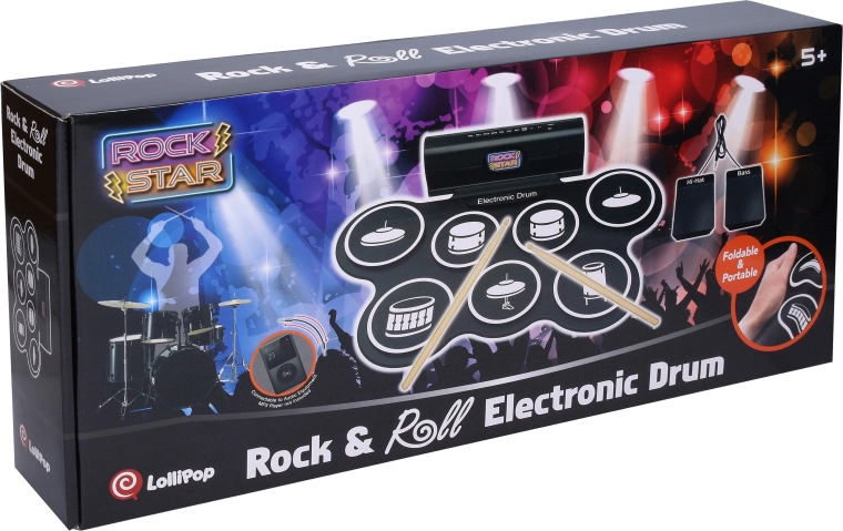 Compact elektronisch drumstel voor thuis en beginners met 7 realistische sounds, 2 pedalen (hi-hat en basdrum), licht- en geluidseffecten en de mogelijkheid om op te nemen en af te spelen. In de verpakking zitten 3× AA-batterijen, een USB‑kabel en een kabel voor mobiel/mp3.