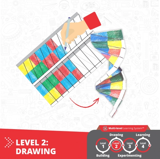 - 4 niveaus van plezier en leren: bouwen, inkleuren, experimenteren, leren