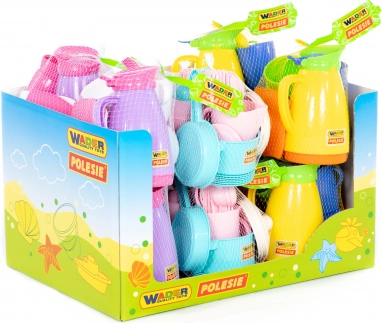 - Kleurige set zonder theepot: 6 kopjes, 6 bordjes, 6 lepeltjes, 6 vorkjes en mesjes, zoutvaatje, pepervaatje, pan met deksel, koekenpan