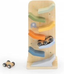 De kleurrijke baan met autootje motiveert tot herhaald spelen, versterkt observatie, coördinatie en inzicht in oorzaak en gevolg.