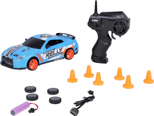 De set bevat ook trainingspionnen voor het bouwen van slalom- of driftparcoursen, een oplaadbare 3,7 V‑accu en een lader. De compacte afmetingen (lengte 18 cm) maken het een uitstekende keuze voor zowel beginners als gevorderde bestuurders.