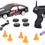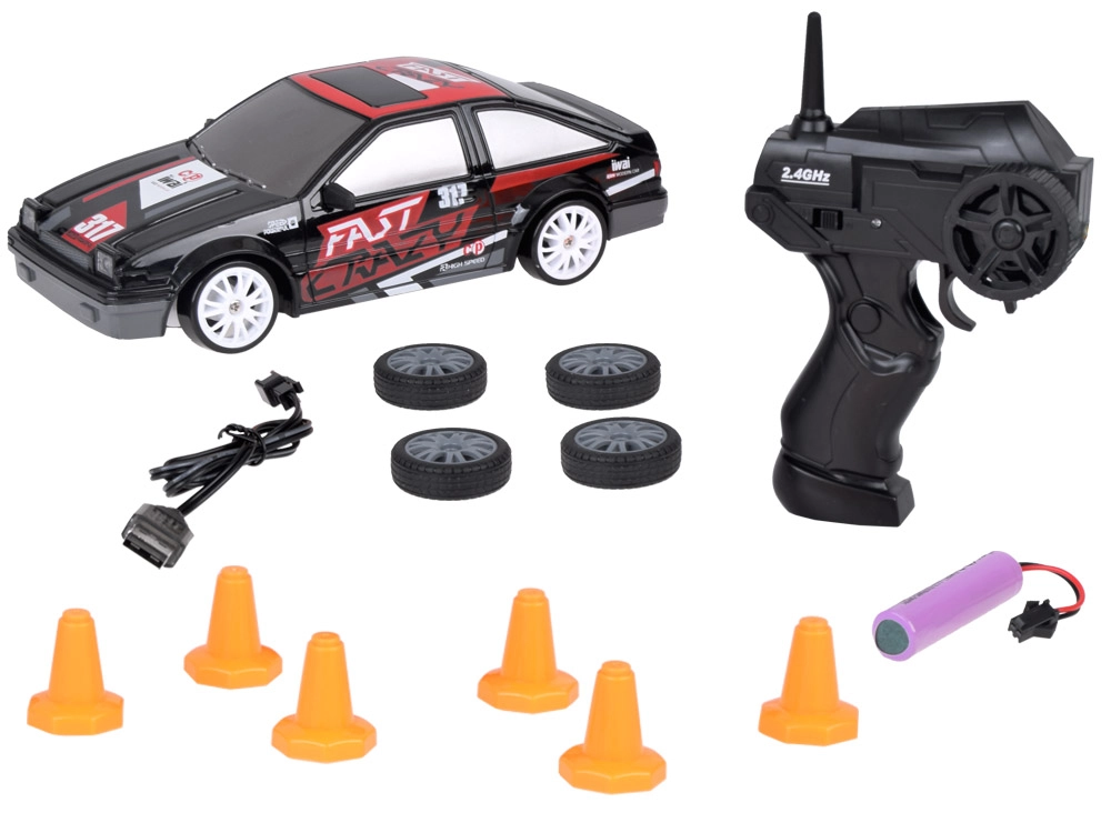 De set bevat 4 reservewielen en kegels om je eigen banen te bouwen, zodat je slalom, precisie en drift kunt trainen. De oplaadbare 3,7 V accu met USB-kabel maakt laden eenvoudig – laad hem vóór het eerste gebruik minimaal 2 uur op.