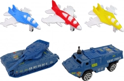 Drie kleurrijke jagers, een rupsbandtank en een pantservoertuig met metalen carrosserie brengen actie op zee en op het land.