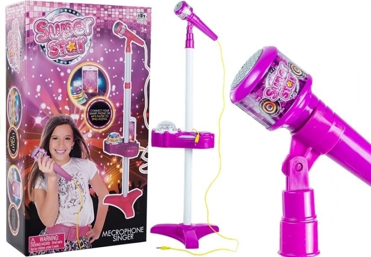 Deze multifunctionele kindermicrofoon op statief verandert de kinderkamer in een klein podium. Het interactieve paneel met ingebouwde luidspreker, knoppen voor het wisselen van begeleiding en volumeregeling wordt aangevuld door een magische disco-projector die gekleurde draaiende lichtjes projecteert. Dankzij de meegeleverde kabel kun je een telefoon of MP3-speler aansluiten en meezingen met je eigen liedjes.