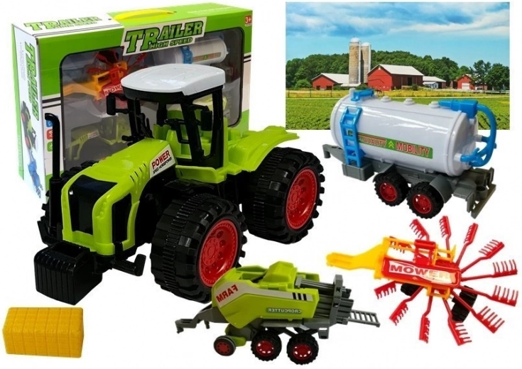 Deze boerderijvoertuigenset laat kinderen kennismaken met de wereld van de moderne landbouw. De groene tractor met robuuste banden trekt diverse aanhangers, waarmee kinderen alles aankunnen van hooiharken en irrigeren tot stro persen. Dankzij het duurzame kunststof en de realistische afwerking is het spel boeiend en veilig.