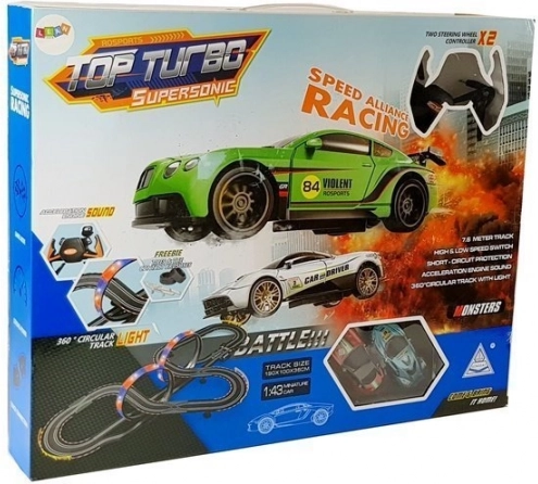 Een realistische racebaan op schaal 1:43 met twee autootjes brengt snelheid, adrenaline en gezonde competitie. De baan met een lengte van 7,6 m biedt spectaculaire loops met een 360°-rotatie, gekleurde LED-effecten en controllers met snelheidsregeling en geluidseffecten. Ideaal voor gezamenlijk spel van twee racers.