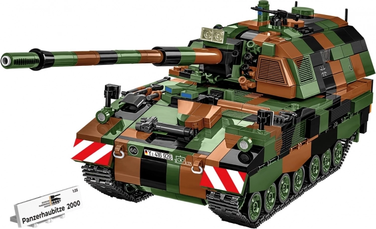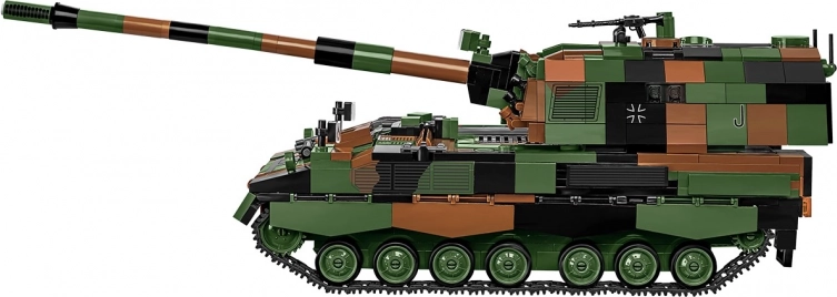 De bouwset Panzerhaubitze 2000 brengt realistische militaire elementen, waaronder camouflagekleuren, een draaibare koepel en een beweegbaar kanon voor een authentieke speelervaring.