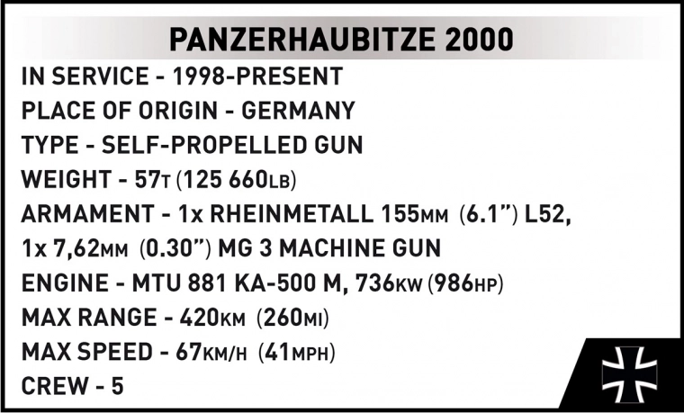 De Panzerhaubitze 2000 staat bekend om zijn hoge vuursnelheid, groot bereik en geavanceerd vuurleidingssysteem, wat het onmisbaar maakt in moderne militaire operaties. Dit model is een getrouwe replica van het echte voertuig, dat sinds 1998 in dienst is bij vele legers wereldwijd, waaronder de Bundeswehr.