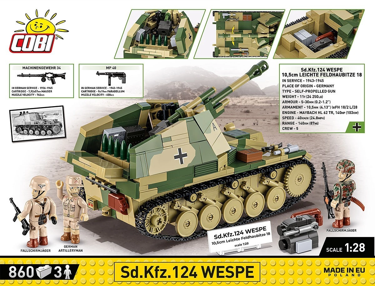 Sd.Kfz.124 Wespe bouwset is de ideale keuze voor fans van historische sets van COBI. Deze bouwset breidt de serie voertuigen op het onderstel van de Panzer II-tank uit en stelt het zelfrijdende kanon Wespe voor. Dit model in de Executive-editie is samengesteld uit 855 onderdelen en is ontworpen in een modelbouwschaal van 1:28.