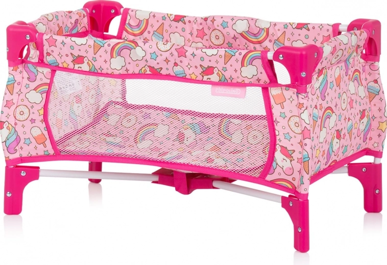 Stabiel frame en hoogwaardige textielen met een eenhoorntjesmotief. Gaas-zijwanden bij het bedje voor beter zicht en een comfortabel stoeltje voor het voeren van poppen ondersteunen veilig spel.
