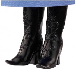 De blauwe rok, het zwarte lijfje met turkooizen details en de roze cape maken Anna direct herkenbaar als heldin.
