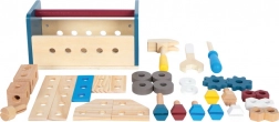 Houten hamer, steeksleutel en schroevendraaier worden aangevuld met schroeven, moeren en geperforeerde delen – alles voor het trainen van fijne motoriek en fantasie.