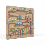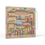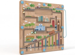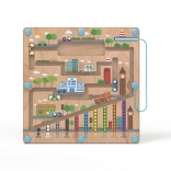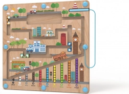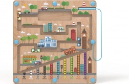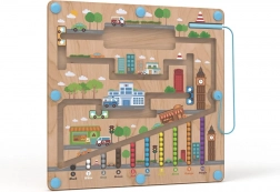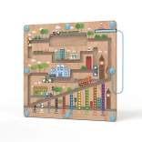Het magnetische speelbord met stads thema biedt kinderen vanaf 2 jaar een boeiende activiteit waarbij ze met de magnetische aanwijzer balletjes over de gemarkeerde paden verplaatsen. De stevige houten basis is afgedekt met een transparante kunststof plaat, zodat de balletjes veilig zijn en niets kwijtraakt.