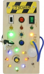 Dit compacte houten LED busy board is ontworpen om kinderen op een begrijpelijke manier te laten zien hoe oorzaak en gevolg werkt. Draai de sleutel in het slot, plug de kabel in het stopcontact, zet schakelaars om en kijk hoe de gekleurde lichtjes aangaan en geluiden klinken. Geweldig voor de ontwikkeling van fijne motoriek, zintuiglijke waarneming en logisch denken.