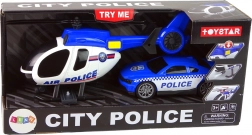 Kruip in de huid van de politie en ga in actie! De grote helikopter met handmatig draaibare rotorbladen (spanwijdte tot 20 cm) heeft een knop voor licht- en geluidseffecten van starten en vliegen, waardoor het spel nog realistischer wordt. De politieauto met herkenbare opschriften, getinte ramen en rubberen banden raast met hoge snelheid over vlakke oppervlakken. De hele set is gemaakt van licht, duurzaam kunststof en is veilig voor kinderen.