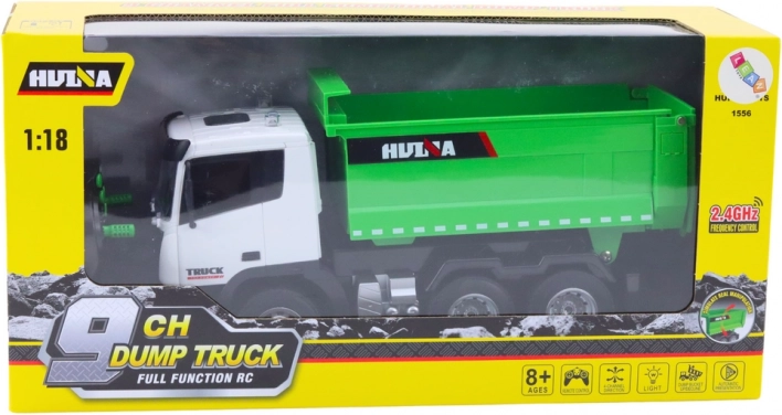 Groene op afstand bestuurbare vrachtwagen biedt realistisch speelplezier. Functies omvatten afstandsbediening, geluiden en een kiepende aanhangwagen. Ideaal voor kinderen vanaf 8 jaar.
