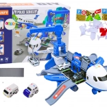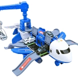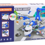 Uitgeklapt verandert het vliegtuig in een mobiel politiebureau met hellingen, opbergruimtes en een platform om autootjes “weg te schieten” voor een snelle interventie. Inclusief 3 politievoertuigen, een draaibare hijsinstallatie 360° met bedieningswiel en een set borden, pylonen en andere accessoires om je eigen stad en wegen te bouwen.