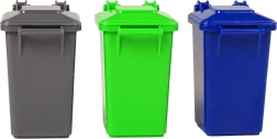 De set bevat drie gekleurde plastic emmers die helpen bij het leren sorteren van verschillende soorten afval.