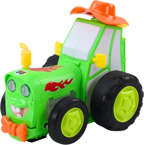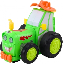 Druk simpelweg tegelijk op twee knoppen en de tractor opent de motorkap, rijdt op twee wielen en laat spectaculaire sprongen zien.