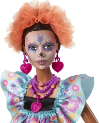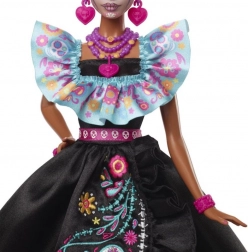Met deze unieke Barbie uit de Dia de Muertos 2024-serie kun je de sfeer van deze bijzondere feestdag rechtstreeks naar je huis halen. De pop is gekleed in verfijnde kleding met een zwarte satijnen rok, een blauwe gerimpelde top en een roze strikband. Deze jurk is versierd met rijke borduursels met botten-, bloemen- en suikerschedelmotieven.