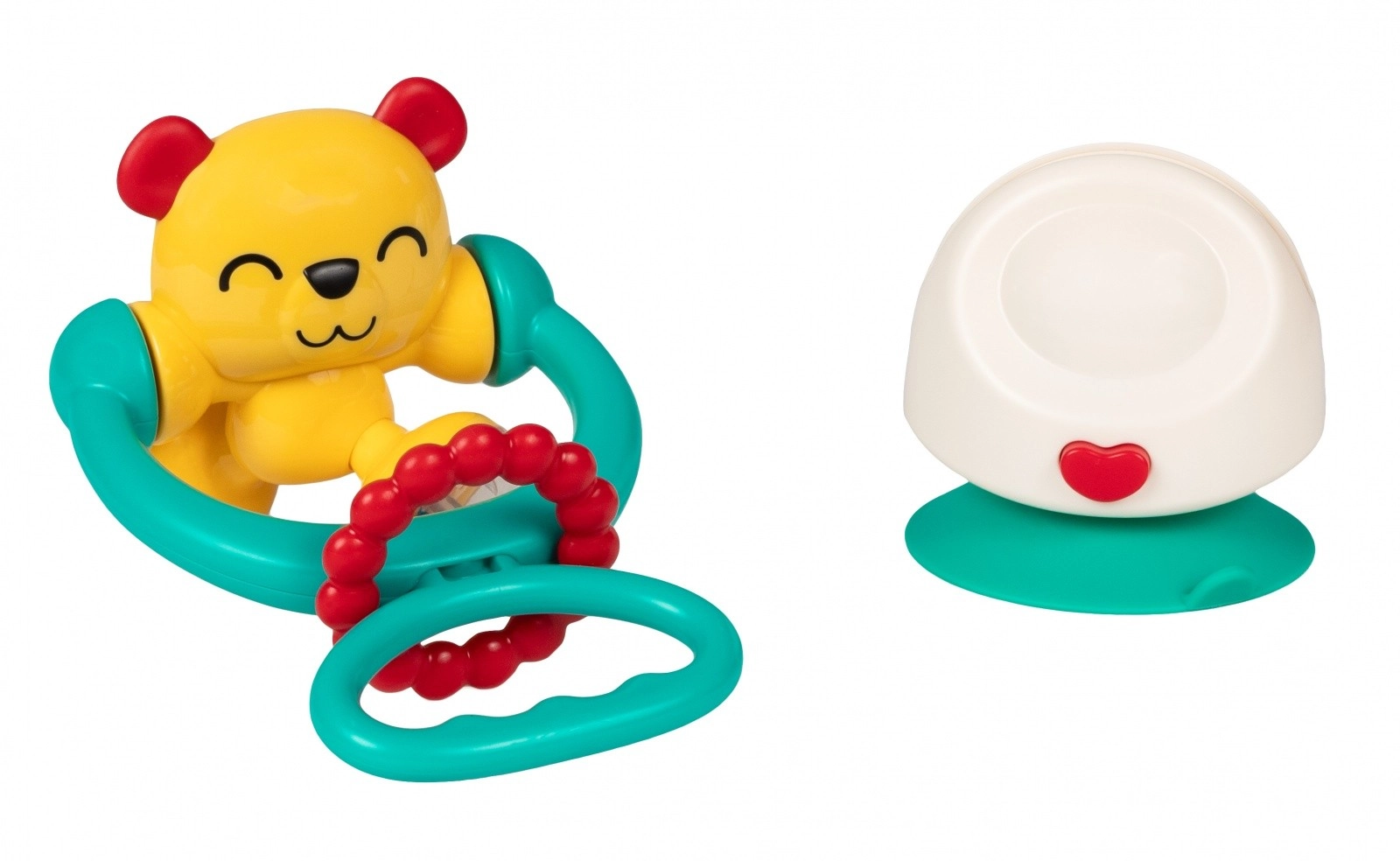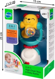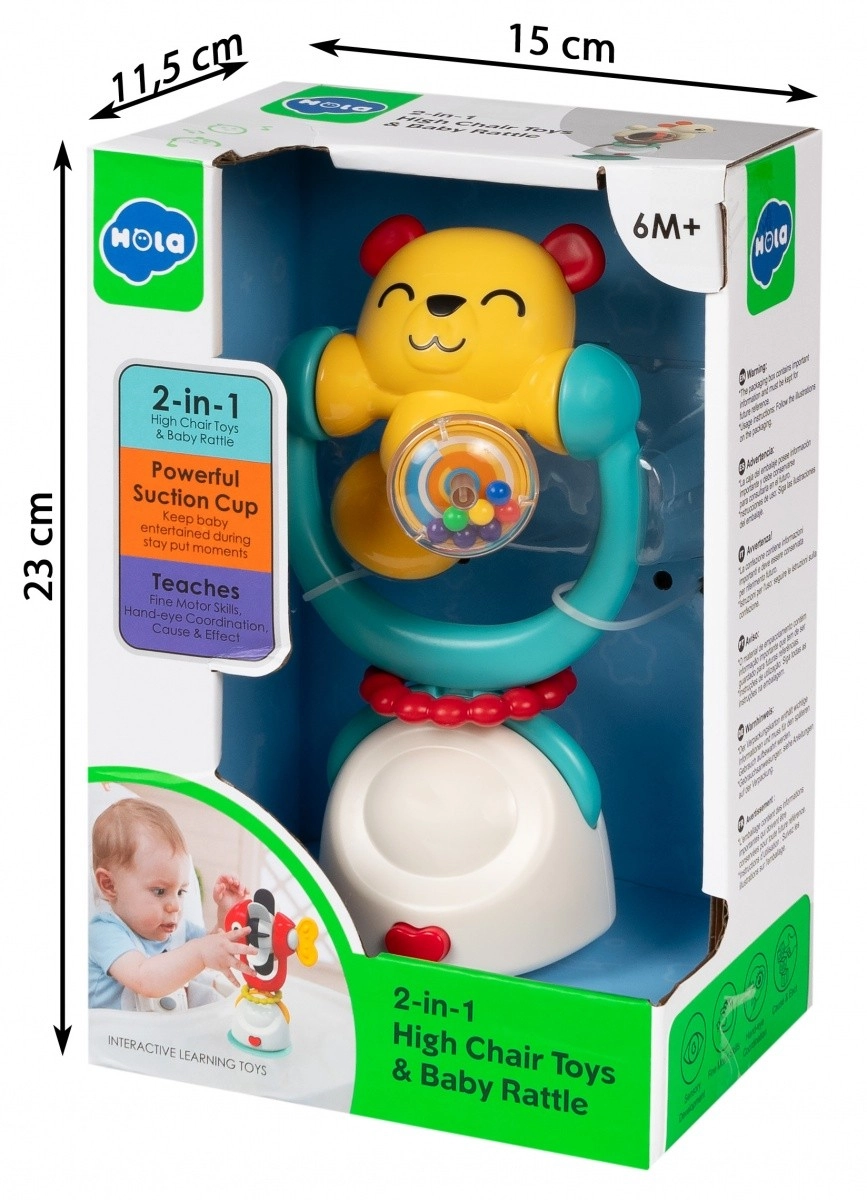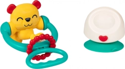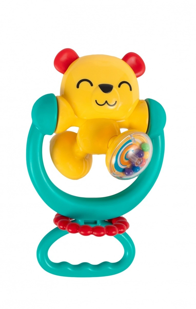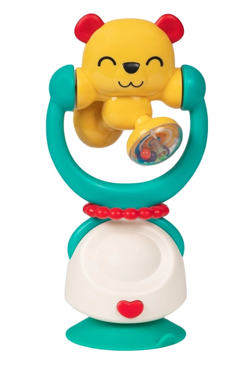 Kleurrijke en interactieve 2-in-1 babyrammelaar in de vorm van een beertje met een stevige zuignap en draaielementen die de ontwikkeling van zicht, gehoor en fijne motoriek stimuleert. Veilige BPA-vrije materialen, geschikt voor een kinderstoel, tafel en andere gladde oppervlakken.