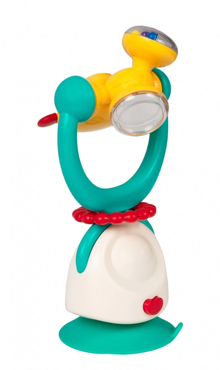 Het schattige beertje trekt de aandacht met heldere kleuren en prettige geluiden. Dankzij de geïntegreerde rammelaar ontdekt het kind het verband tussen beweging en geluid, terwijl de draaibare top nieuwsgierigheid en hand-oogcoördinatie prikkelt. De sterke zuignap houdt het speeltje stabiel op gladde oppervlakken – ideaal voor op de kinderstoel of tafel.