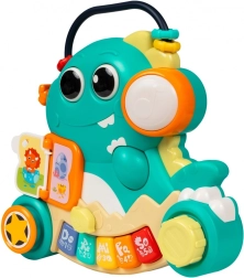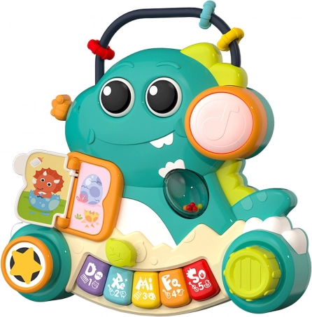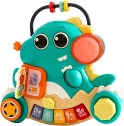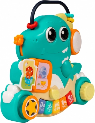 Het kind kan het bijtje verschuiven en zien hoe de dino met zijn ogen beweegt, of aan het wieltje op de poot draaien en naar verschillende melodieën en geluiden luisteren. De modus-schakelaar laat kiezen tussen de muziekmodus en de geluidsmodus – ideaal voor afwisselend en prikkelend spel.