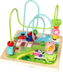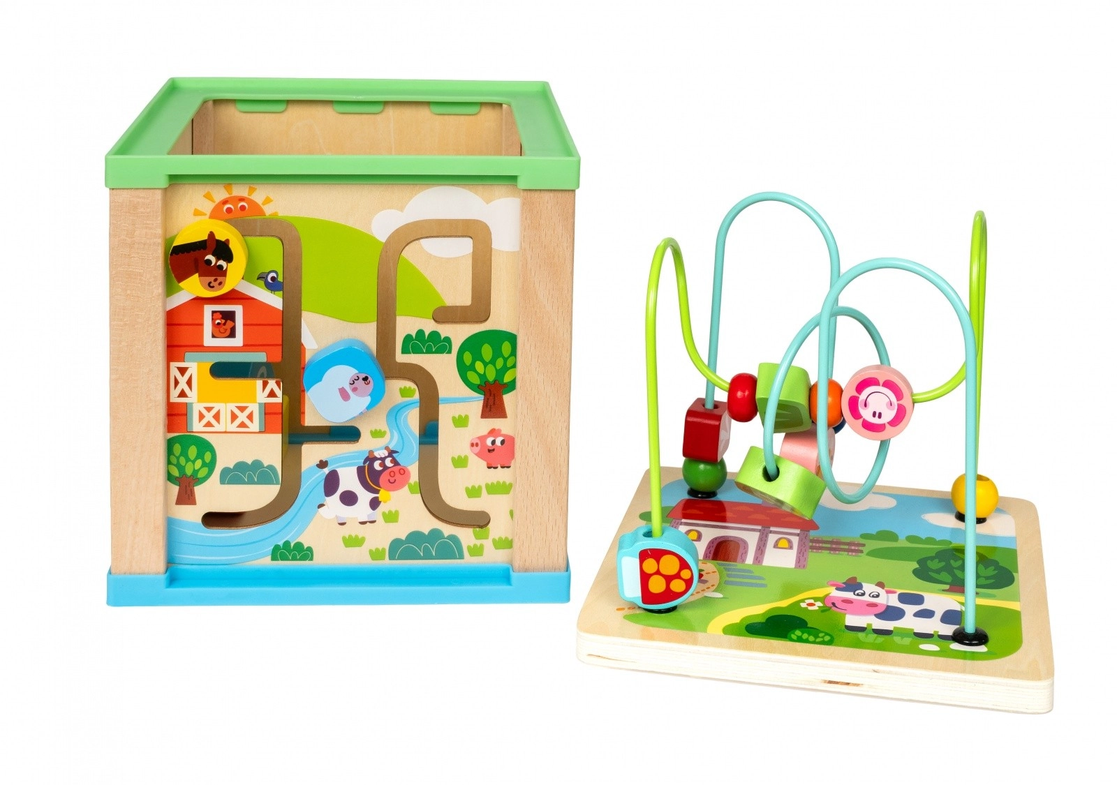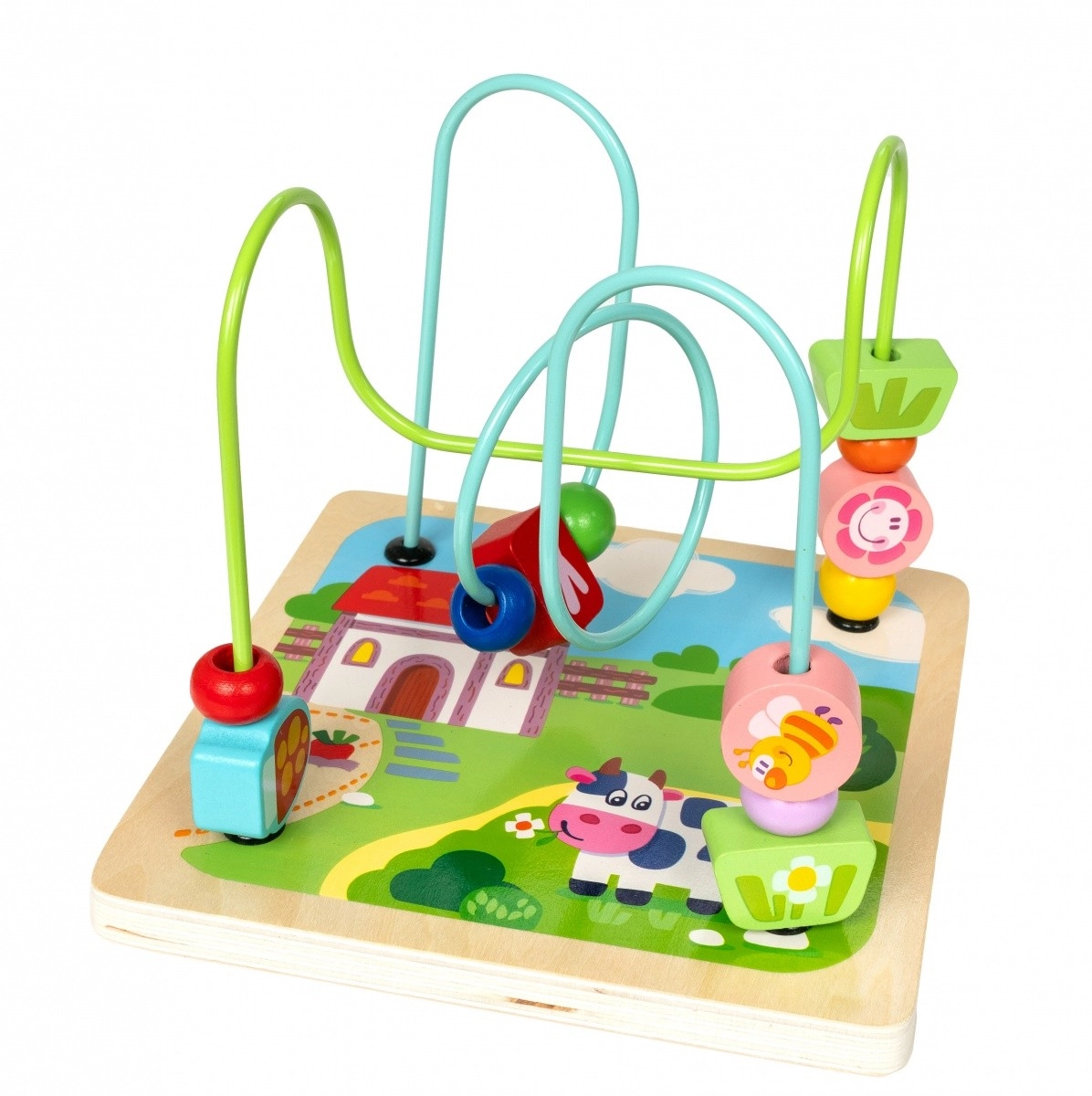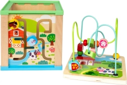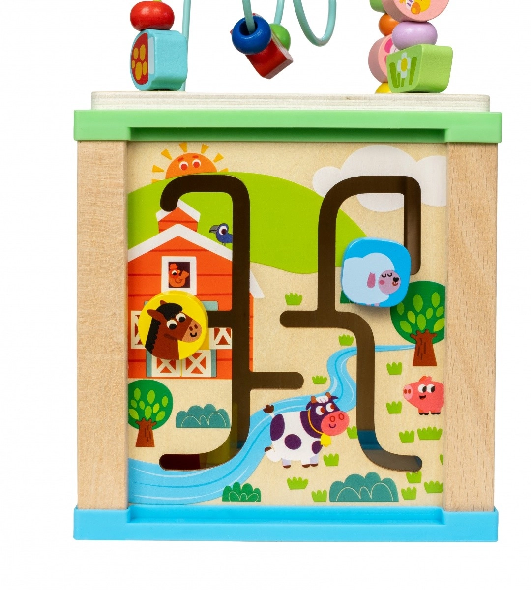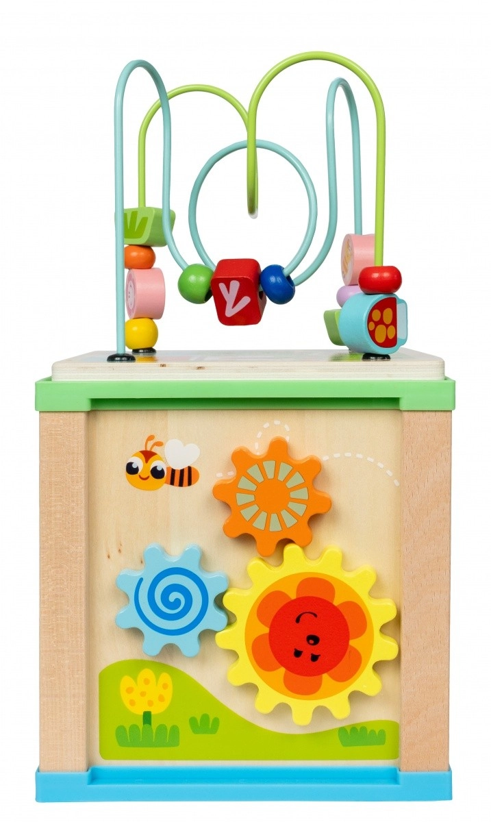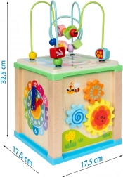 - Doolhof: Aan één zijde van de kubus bevindt zich een doolhof met schuifbare kralen. Kinderen kunnen de kralen langs kronkelige paden bewegen, wat bijdraagt aan de ontwikkeling van motorische vaardigheden en oog-handcoördinatie.