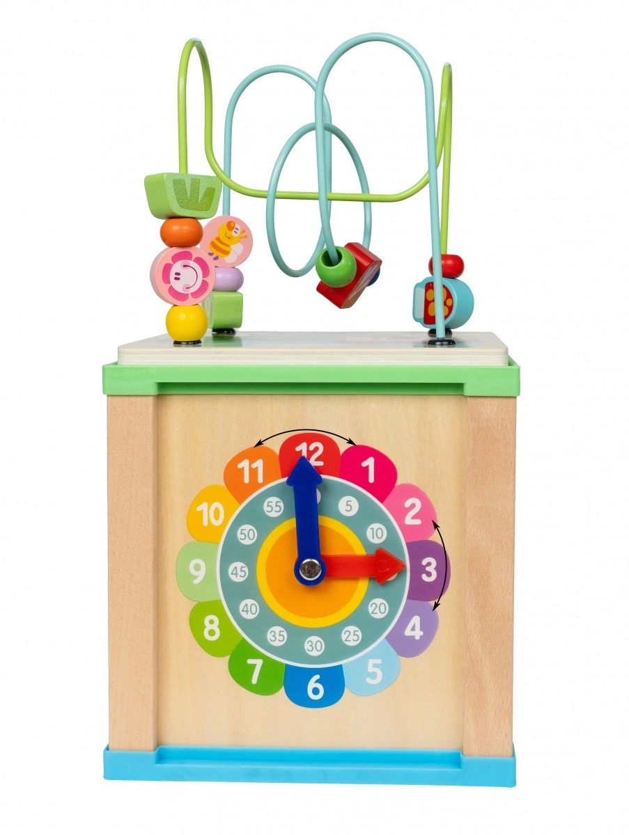 - Klok: De klok met beweegbare wijzers aan een van de zijden van de kubus stelt kinderen in staat de basis van tijd, zoals uren en minuten, te leren en het herkennen van cijfers te oefenen.