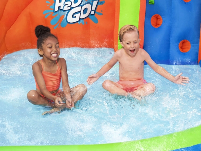 Het Bestway H2O GO! waterpark is een all-in-one attractie voor actieve waterpret in de tuin. De robuuste glijbaan met bovenplatform, beschermd met een net, mondt uit in een ruime pool, terwijl de geïntegreerde sproeier en verrassende kiepemmer de glijbaan en kinderen heerlijk nat houden. Dankzij het snel opblazen met de krachtige blower is het park in minder dan 2 minuten klaar voor gebruik.