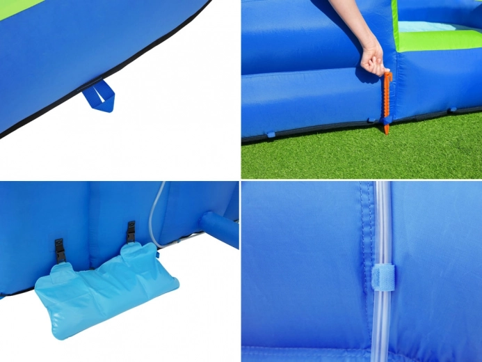 Het duurzame materiaal van polyester met PVC-oppervlak en de doordachte verankering zorgen voor stabiliteit. In de verpakking zit alles wat je nodig hebt: blower, haringen, sproeislang en een praktische draagtas. Ideaal voor familiefeesten, weekenden en dagelijkse waterpret onder toezicht van volwassenen.
