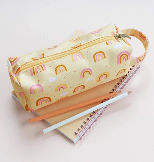 Maak kennis met de stijlvolle en praktische etui voor kleurpotloden met regenboogmotief. Gemaakt van duurzaam polyester, ideaal voor kinderen onderweg of op school.