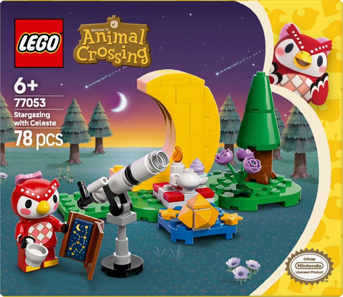 Ontdek de magie van de nachtelijke hemel met LEGO Animal Crossing – Sterrenkijken met Celeste. Kinderen bouwen een charmante kampeerplek met telescoop, kampvuur en een stoel in de vorm van een halve maan en beleven iconische momenten uit de game ANIMAL CROSSING opnieuw. De minifiguur van uil Celeste met een astronomieboek inspireert tot het verkennen van het heelal en tot het vertellen van eigen verhalen, weg van het scherm.