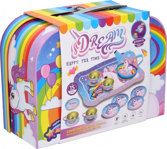 Magische theeset in een schattig koffertje met eenhoorn-motief, een feest voor elke kleine gastvrouw. Bevat een theepot, 4 kopjes, 4 schoteltjes en 4 bordjes, allemaal van duurzaam metaal. Het praktische koffertje met handvat heeft afmetingen van 25 × 19 × 10 cm – ideaal voor op reis en om op te bergen.