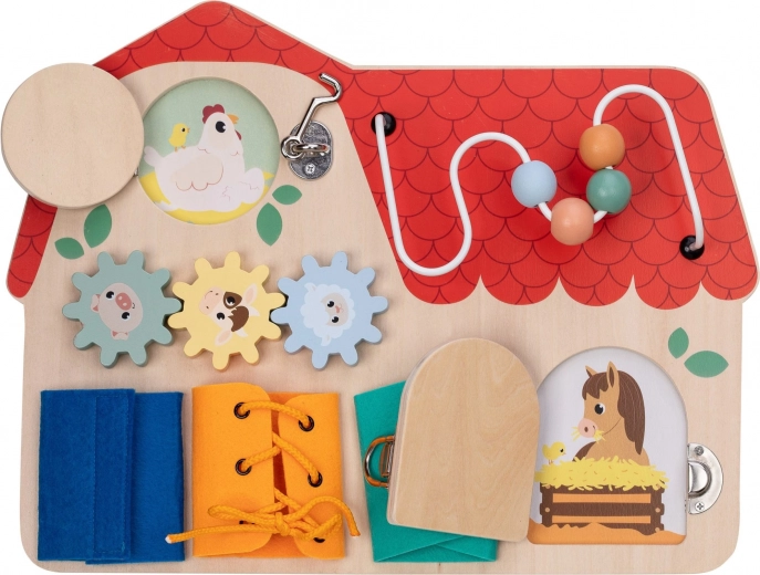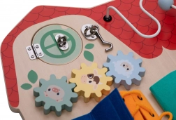 Dit hoogwaardige houten activiteitenbord is ideaal voor kinderen vanaf 18 maanden. Openklapbare raampjes, gespen, ritsen, veters, tandwielen en eenvoudige sloten bieden uiteenlopende activiteiten die vaardigheden spelenderwijs ontwikkelen. De stevige afwerking en opvallende kleuren nodigen uit tot ontdekken en zelfstandig uitproberen.