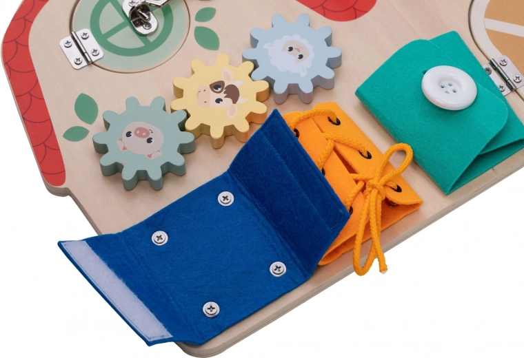 Openklapbare raampjes, sloten, ritsen en veters ondersteunen de fijne motoriek en het oefenen van vingerbehendigheid op een speelse manier.
