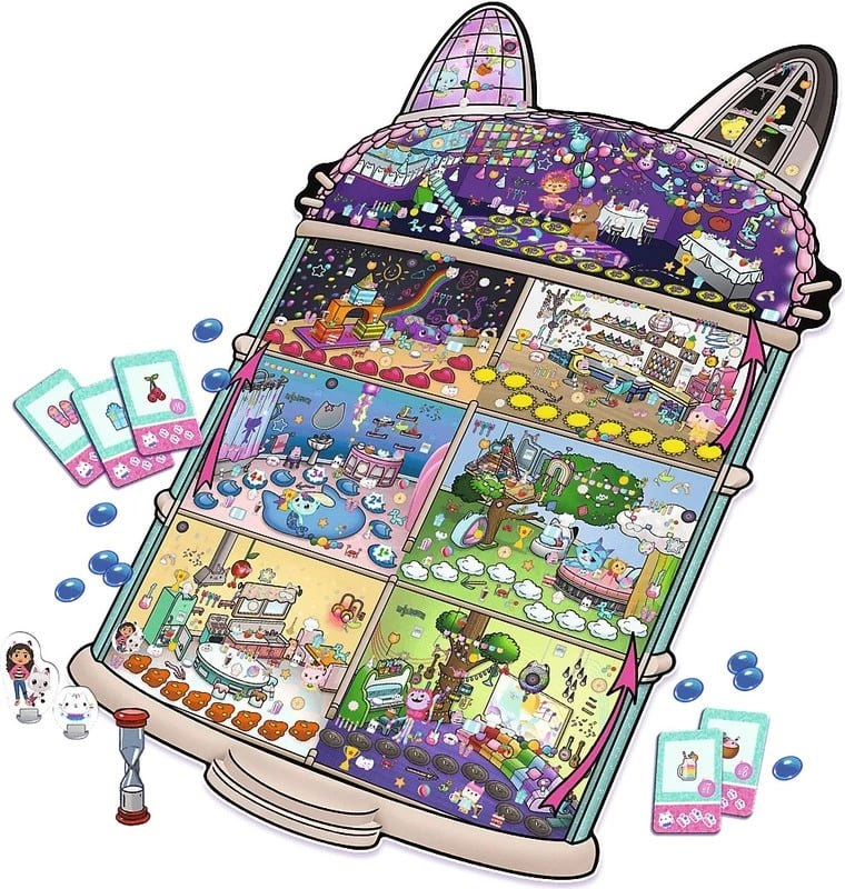 Inhoud van de doos: speelbord in de vorm van een kattenhuis, 2 pionnen met bases, zandloper, kaartjes met aanwijzingen (56 stuks), speciale aanwijzingen (10 stuks) en spelregels.