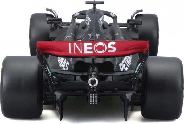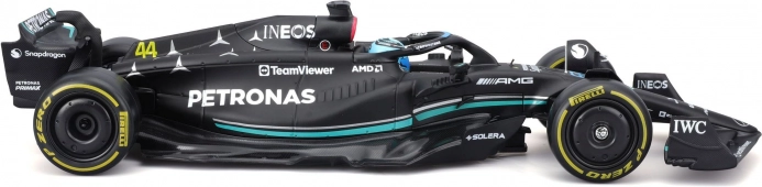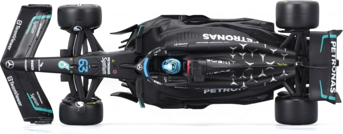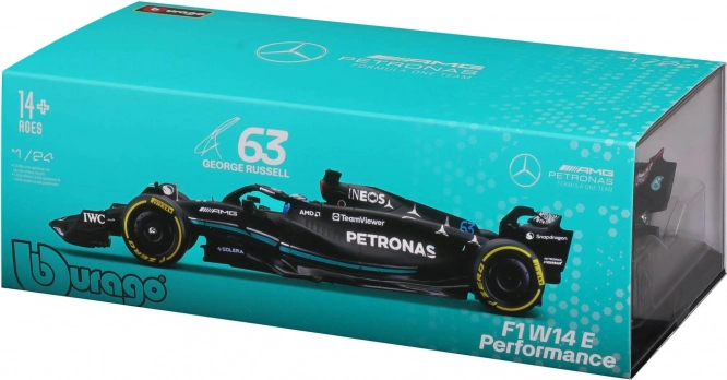 Gedetailleerd metalen model van de MERCEDES‑AMG PETRONAS F1 W14 op schaal 1:24 met startnummer 63 van coureur George Russell. Nauwkeurige afwerking met authentieke lak, realistische aerodynamische elementen, sponsorsbedrukking en vrij draaiende wielen maken het tot een prachtig verzamelobject en een elegante decoratie voor bureau of vitrinekast.