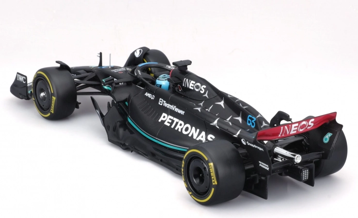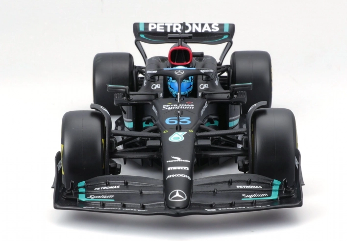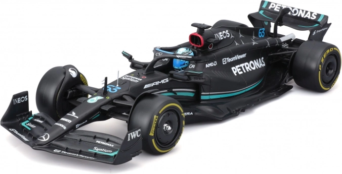 Getrouwe reproductie van vormen, lak en sponsorlogo’s van de MERCEDES‑AMG PETRONAS F1 W14 (2023) met startnummer 63 voor George Russell.