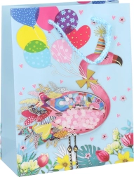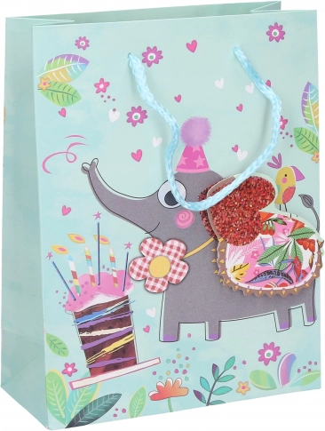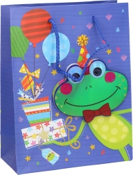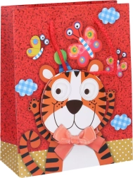 Een schattige cadeautas voor kinderen in maat S die elke jarige blij maakt. Hij heeft een praktisch formaat van 23 × 18 × 8 cm en motieven van vier favoriete dieren: flamingo, tijger, olifant en kikker. Ideaal voor het verpakken van kleinere cadeaus, speelgoed en snoep.