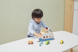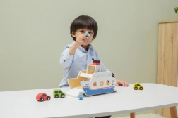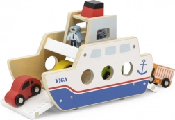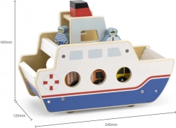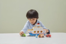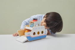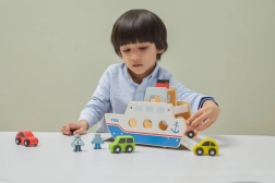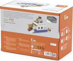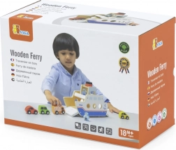 Deze hoogwaardige houten veerboot maakt alle kleine liefhebbers van voertuigen en boten blij. De boot rijdt op wieltjes, waardoor hij gemakkelijk te verplaatsen is, en heeft neerklapbare oprijplaten aan beide kanten, zodat autootjes comfortabel kunnen op- en afrijden. De robuuste afwerking en gladde randen zijn ideaal voor kinderen vanaf 18 maanden.