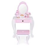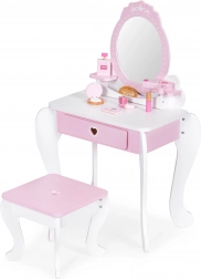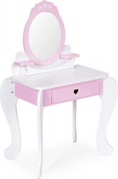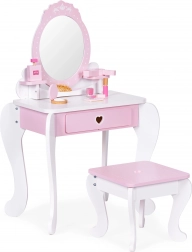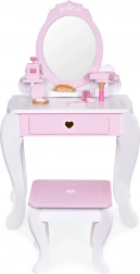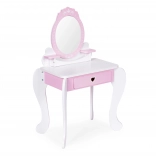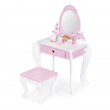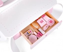 De kaptafel is gemaakt van veilig hout en ontworpen om de ontwikkeling van motorische vaardigheden en fantasie te stimuleren. Ze maakt het ook mogelijk de basis van make-up te leren. Praktische kenmerken zijn onder meer een uitschuifbare lade en twee plankjes die zorgen voor een georganiseerde en opgeruimde tafel.