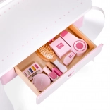 De kaptafel is uitgerust met realistische accessoires en een decoratieve grote spiegel, en vervult de droom van elke kleine visagiste. Tijdens het spelen ontwikkelt het kind motorische vaardigheden en verbeeldingskracht en leert het de basis van make-up aanbrengen.