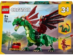 Met de LEGO Creator 3-in-1 Middeleeuwse draak stappen kinderen eenvoudig een wereld binnen van ridders, kastelen en mythische wezens. Het hoofdmodel is een gedetailleerde groene draak met verstelbare vleugels, nek, bek, poten en staart, zodat hij in actieposes kan worden neergezet. Inclusief een schatkist voor nog rijkere verhalen.