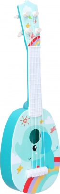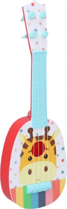 Deze kindergitaar met Afrikaanse dierenmotieven is ideaal voor jonge beginners. Het heeft vier kunststof snaren en een lengte van 37 cm, wat het een perfecte keuze maakt voor makkelijk vasthouden en spelen.