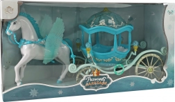 Betreed een sprookjeswereld met een elegante koets, getrokken door een gevleugeld paard in de stijl van Pegasus. Dankzij de knipperende lampjes op de koets komt elk avontuur tot leven en genieten kinderen van talloze magische verhalen.