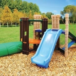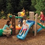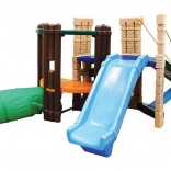 De glijbaan, klimrampen en tunnel vormen een gevarieerd parcours dat kinderen motiveert tot beweging en de ontwikkeling van grove motoriek en coördinatie.
