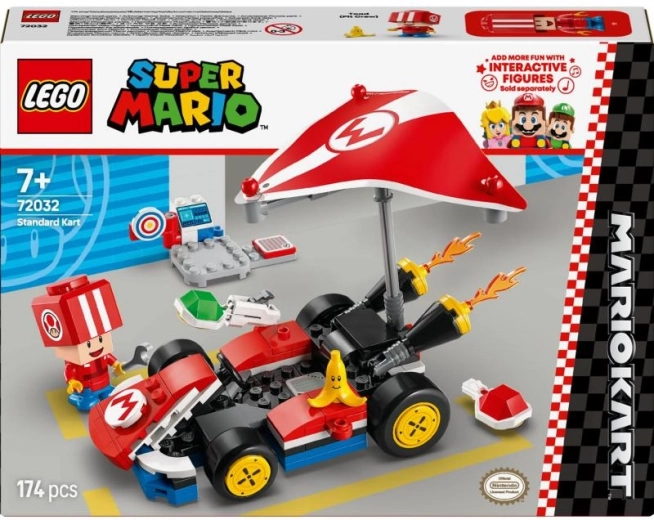 Maak je klaar om te racen, driften en gliden met de LEGO Super Mario Mario Kart – Standaard kart. Inclusief Toad van de pitcrew, een afneembare Super Glider, wielen voor drift en het afvuren van schilden op een doel. Koppel met de interactieve figuren LEGO Mario, LEGO Luigi of LEGO Peach voor geluids- en visuele effecten en nog leuker spel.