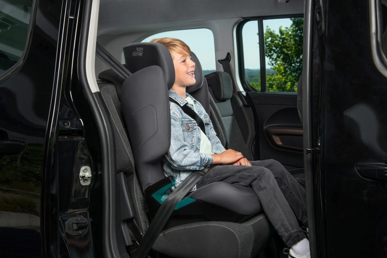 De gevoerde stoffen bekleding en het geoptimaliseerde zitgedeelte zorgen voor comfort op langere ritten. Dankzij het slanke ontwerp kunnen drie stoelen naast elkaar op de achterbank worden geplaatst. Hulpaanduidingen op de hoofdsteun maken het eenvoudig om de stoel af te stellen wanneer je deze tussen voertuigen verplaatst.