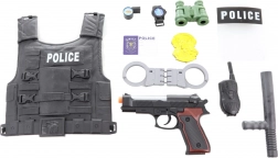 De set bevat een vest, een batterijpistool, handboeien, een verrekijker en andere accessoires voor realistisch politievriendje spelen.